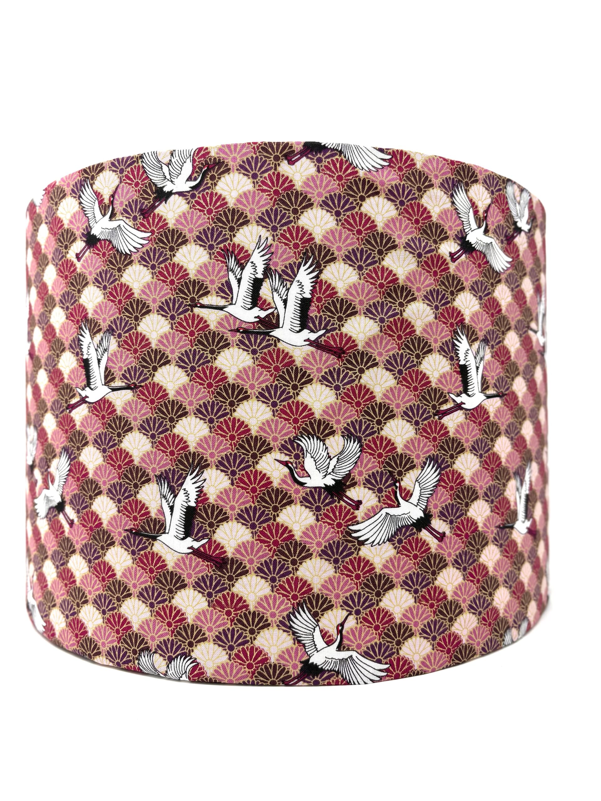 Round drum-shaped lampshade, covered by hand in a Japanese cotton fabric featuring cranes and dahlias in shades of pink/plum/purple. Dramatic highlights of metallic gold colour catch the light.