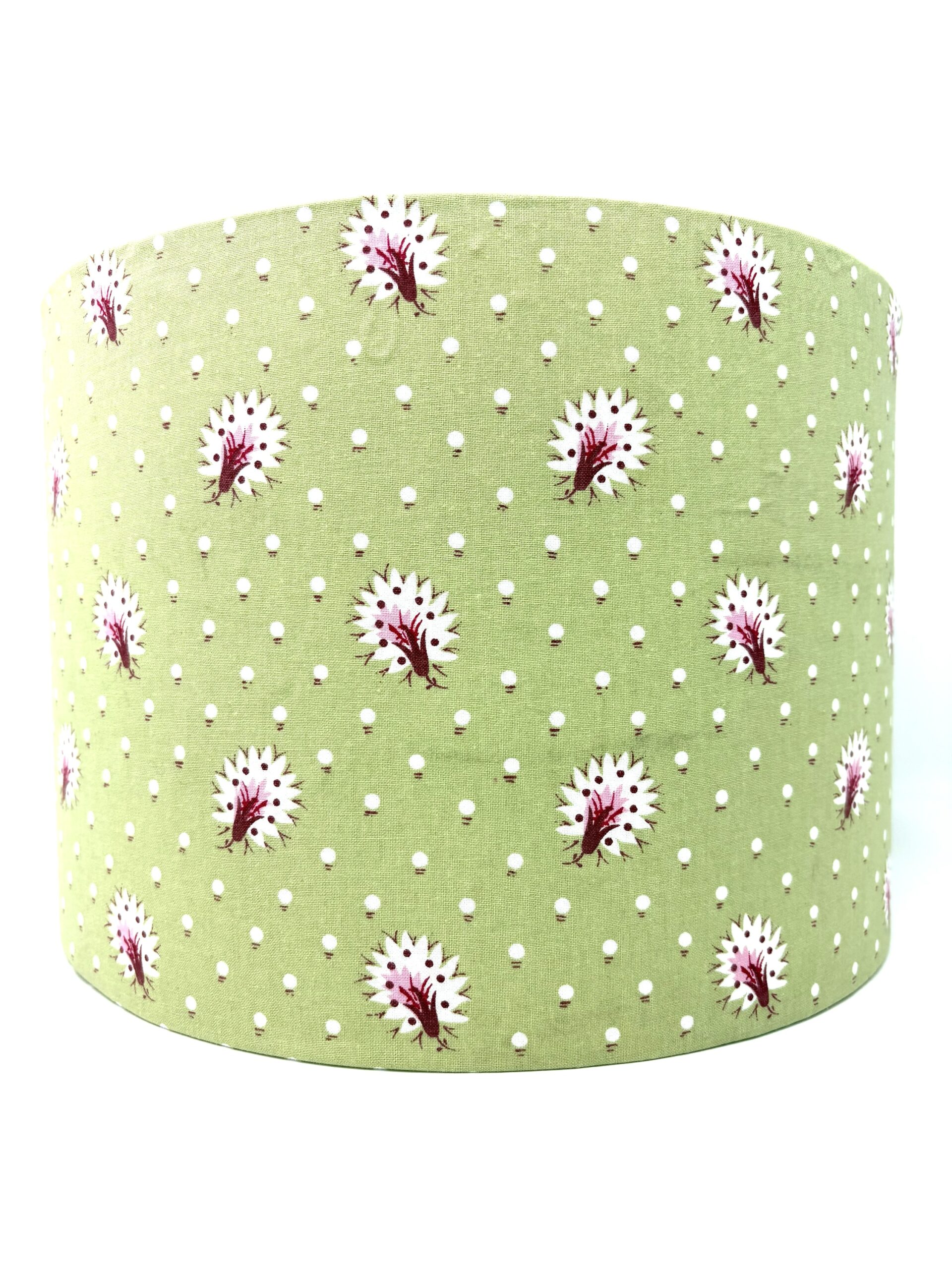 Round drum-shaped lampshade, covered by hand in a vintage Laura Ashley fabric in warm green.